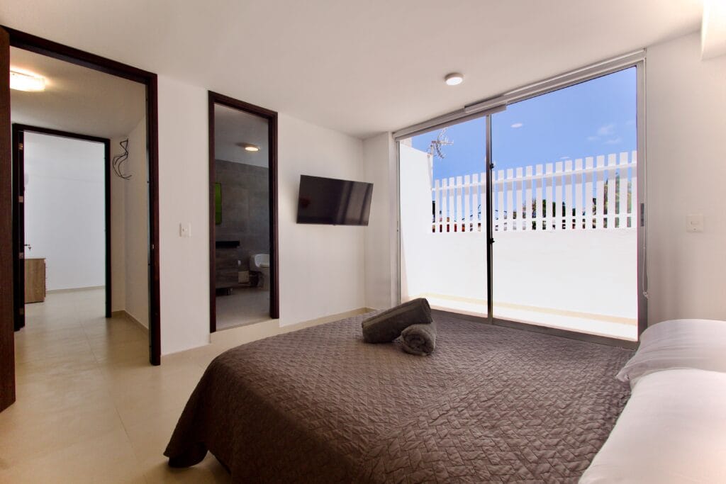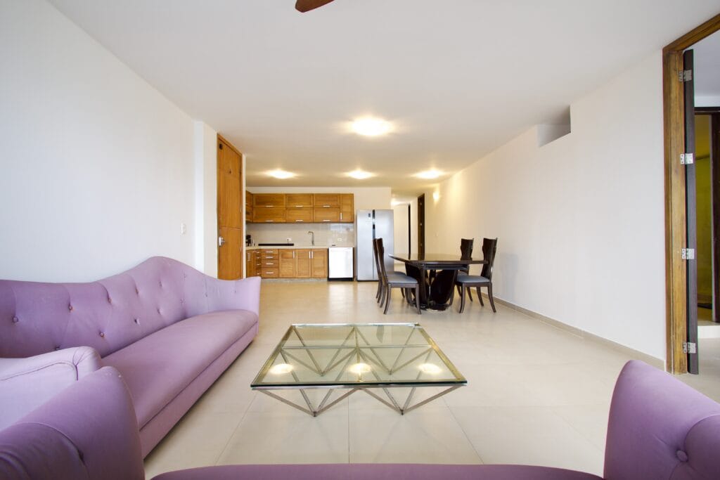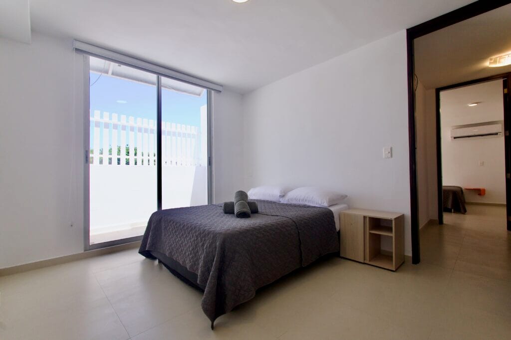 Apartamento para pareja, tiene una cama doble dentro de la habitación, baño grande un sofá cama doble y hamaca en la sala y un balcón trasero con lavadero para secar la ropa de playa.